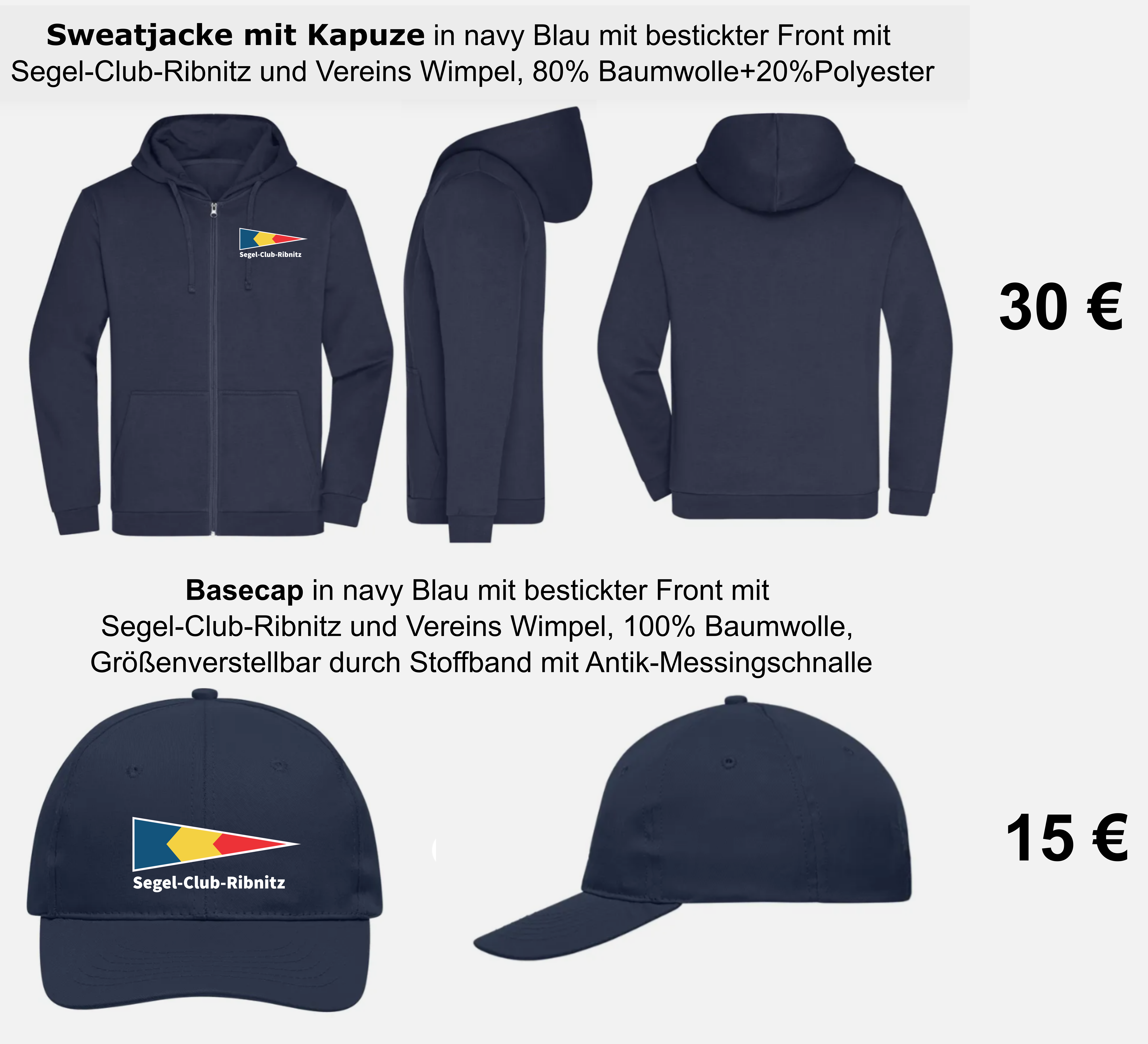 Bestickt mit „Segel-Club-Ribnitz“ und unserem Vereinswimpel auf der Front, 80 % Baumwolle / 20 % Polyester. Einheitspreis: 30 €. -